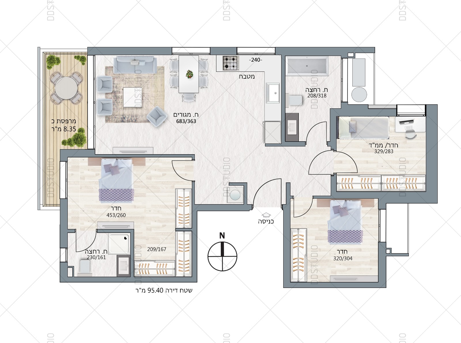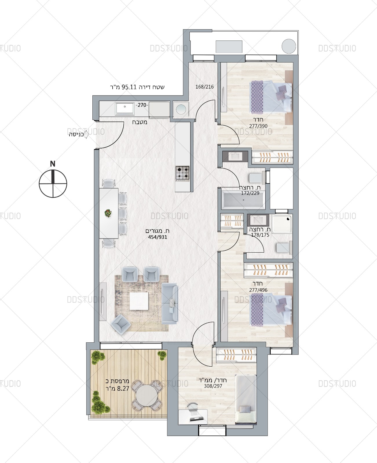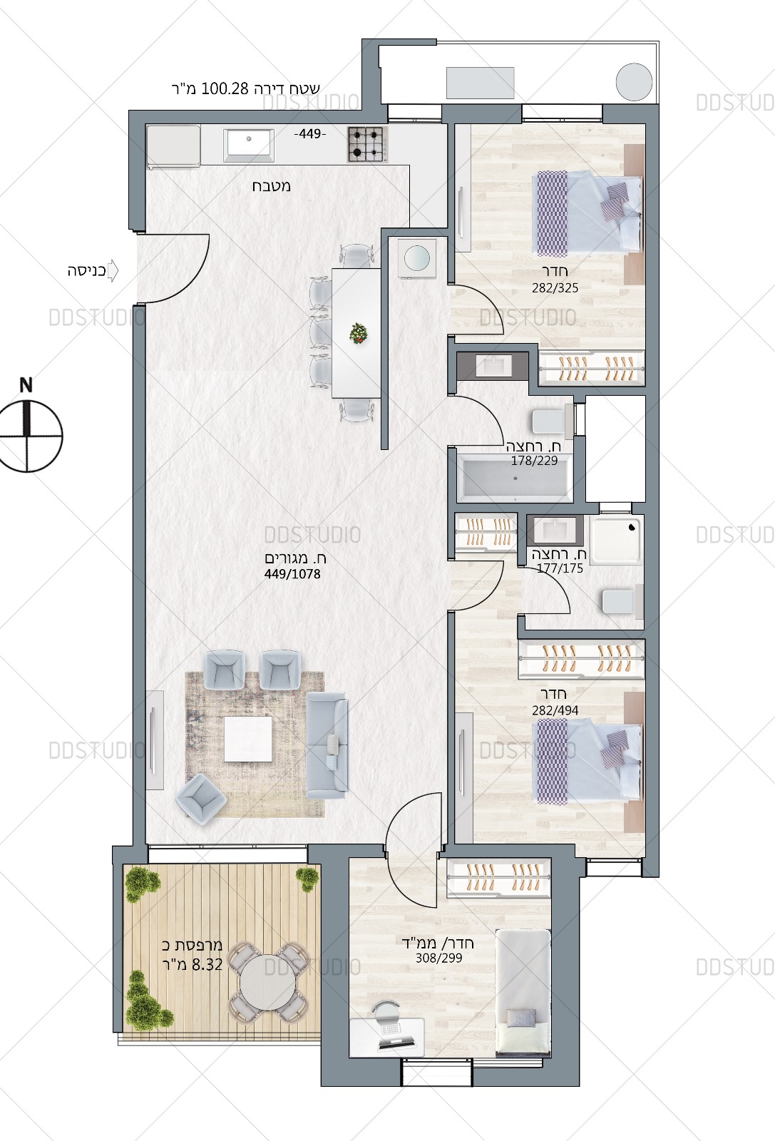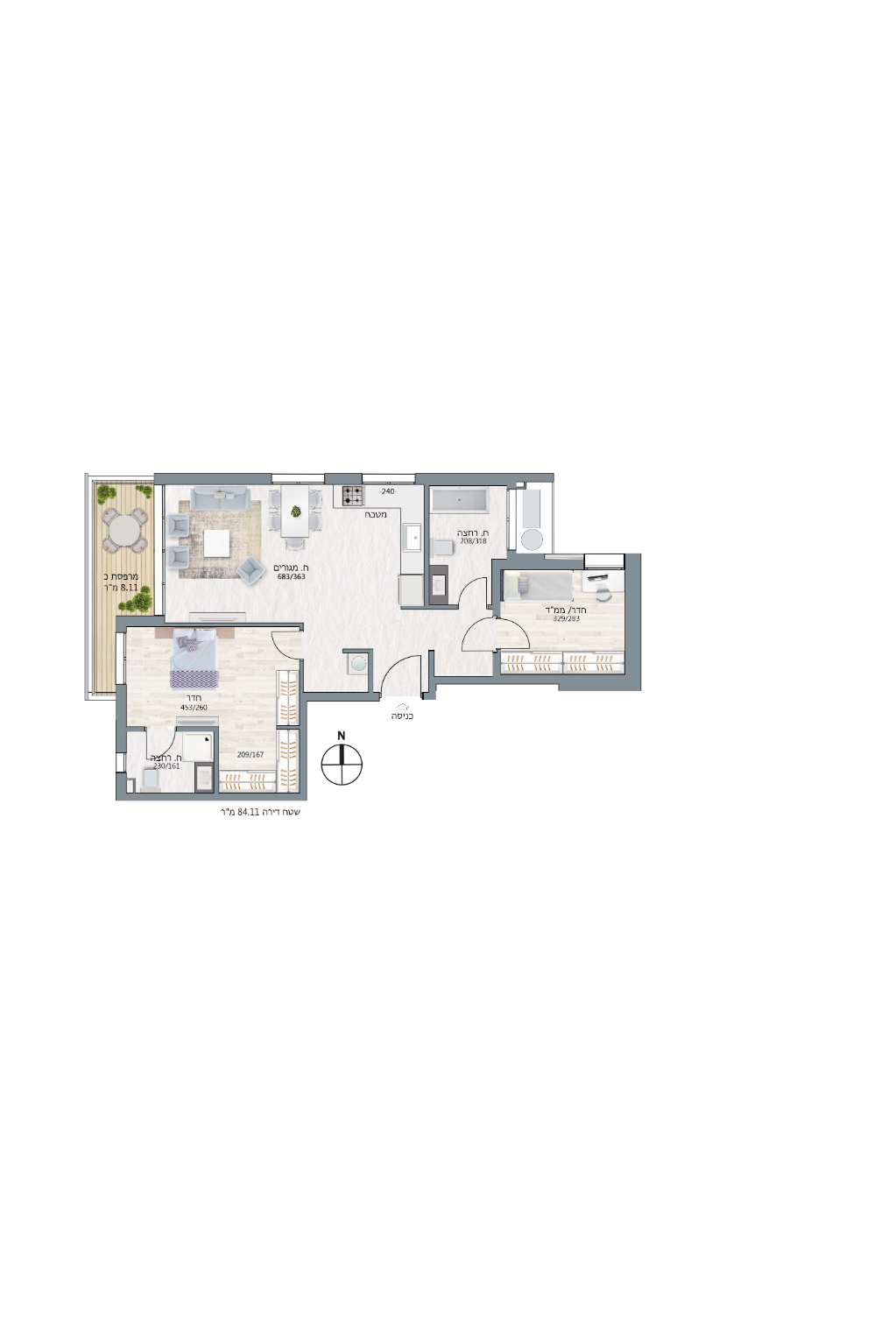 בבניין דירות 3 חדרים ו 4 חדרים בקומות 5 עד 7 בסטנדרט גימור גבוה, וכן דירות דופלקס פנטהאוס בקומות 7-8.